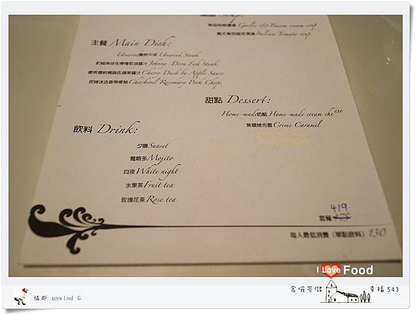 以套餐的方式呈現,共有四道主餐可選擇,訂價為$419元