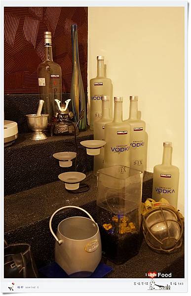 角落的階梯則是擺放了許多空酒瓶和一些調酒道具
