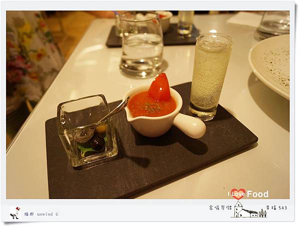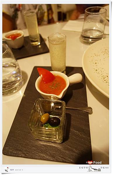 透明玻璃杯裝的是綠.黑橄欖和薄荷葉,很有創意的前菜