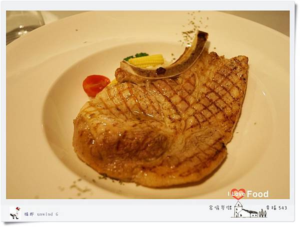 大大的一塊帶骨豬排佔滿了整個盤面,上頭有著整齊的格紋烤痕