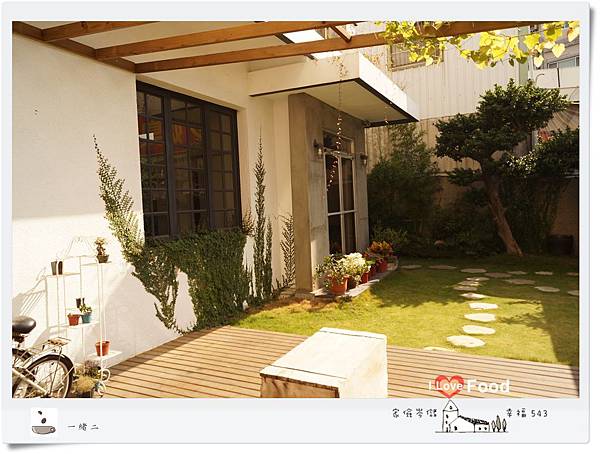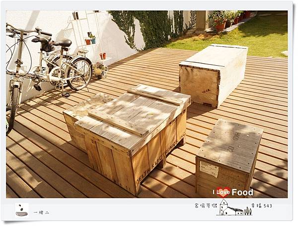 進門瞧瞧啦!前院的右側架了個木棧台,在棚子上的葡萄樹灑落了陽光的影子