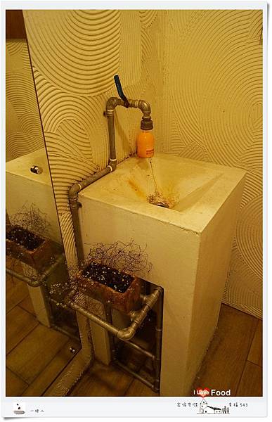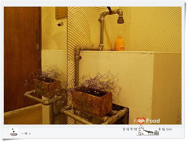 洗手間裡的設計,一氣呵成的水管是水龍頭也是個花架,很特別