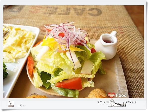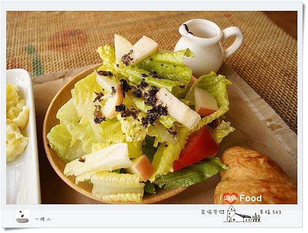 再來看看沙拉,層層堆壘起的生菜像座小山佇立在這個木盤上,加上一些蘋果來點綴